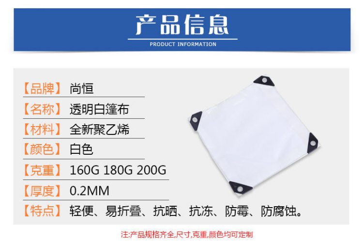 透明白色PE防水篷布產(chǎn)品信息參數(shù),篷布產(chǎn)品規(guī)格齊全,尺寸、克重、顏色均可定制。